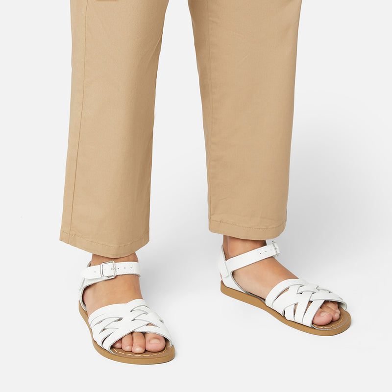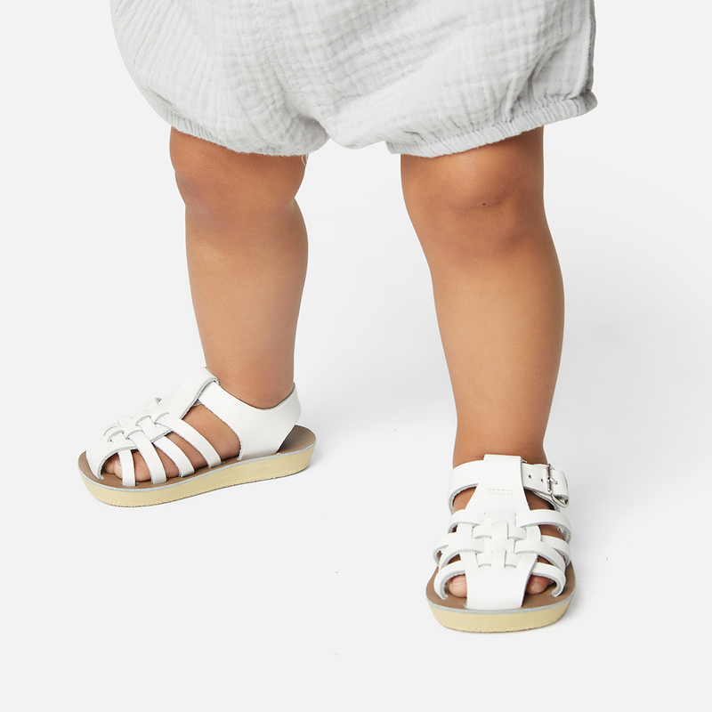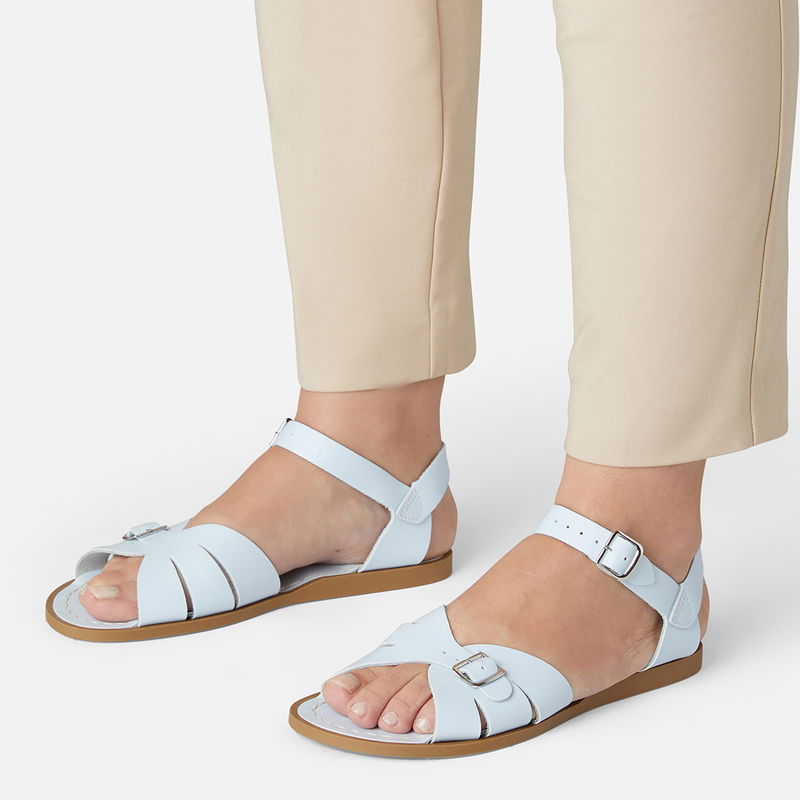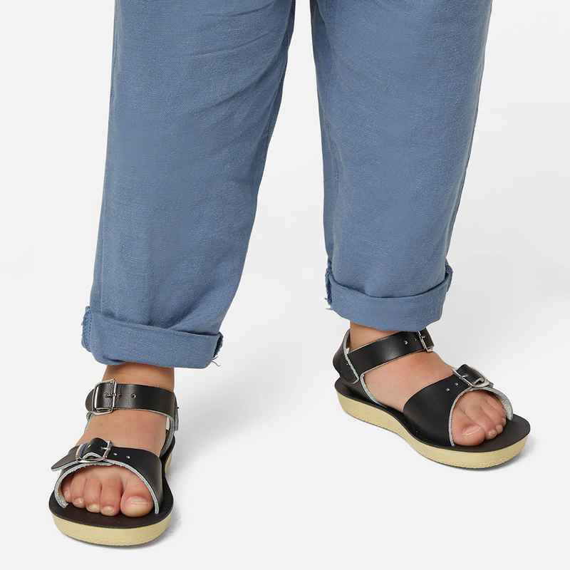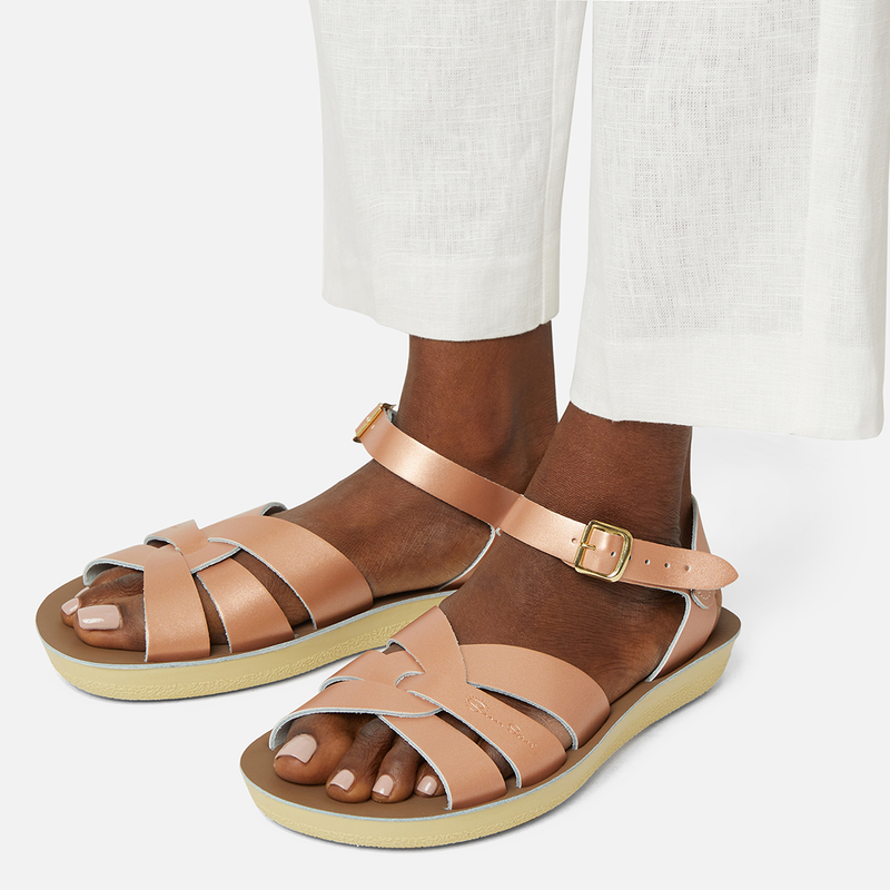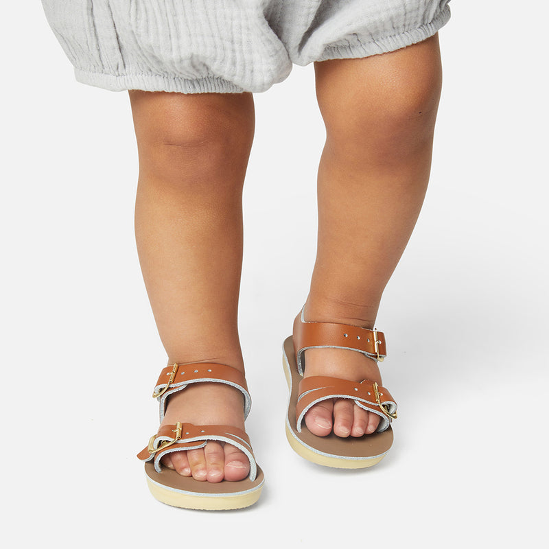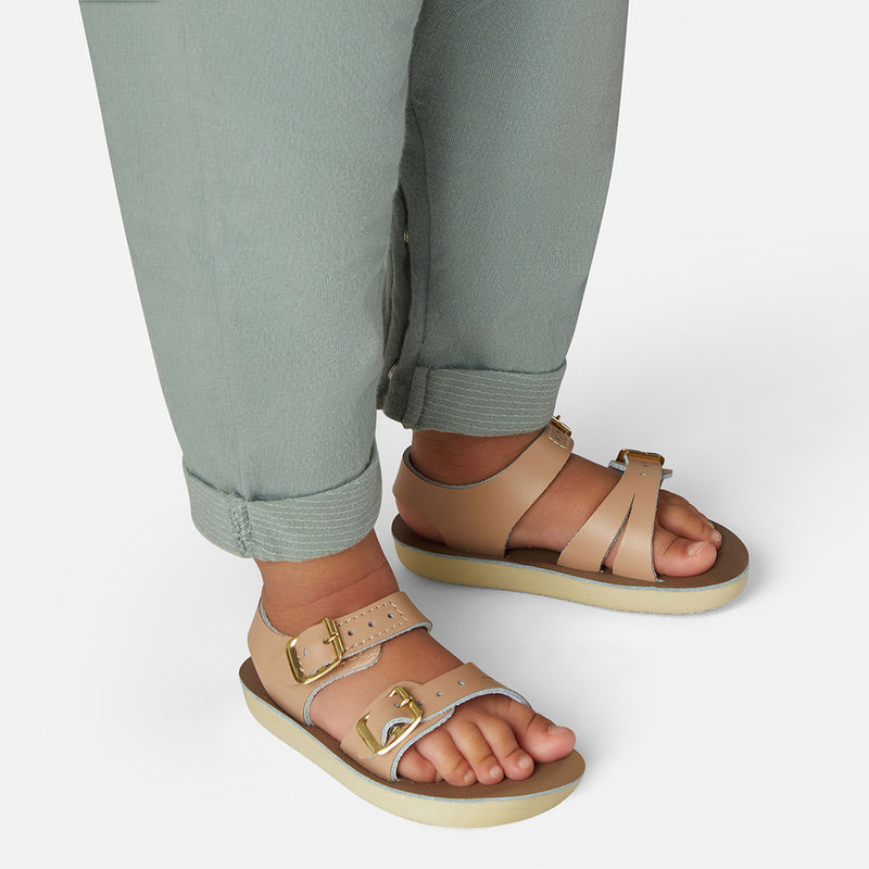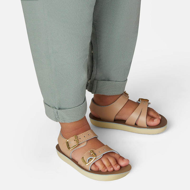 The Tan Salt-Water sandal was the first ever Salt-Water to come out of the Hoy workshop back in 1944. 80 years later and this iconic sandal design lives on. It is a simple, versatile classic and looks lovely on all skin tones. The Tan Original Salt-Water Sandal has our signature hand stitched sole and water resistant plaited leather upper. All Salt-Waters come with rust proof buckles, can be worn in water and be hand-washed with a gentle detergent. Perfect tan coloured sandals - did you know? these tan strappy sandals, they go from children's all the way through to adult sizes so are perfect for the whole family!
